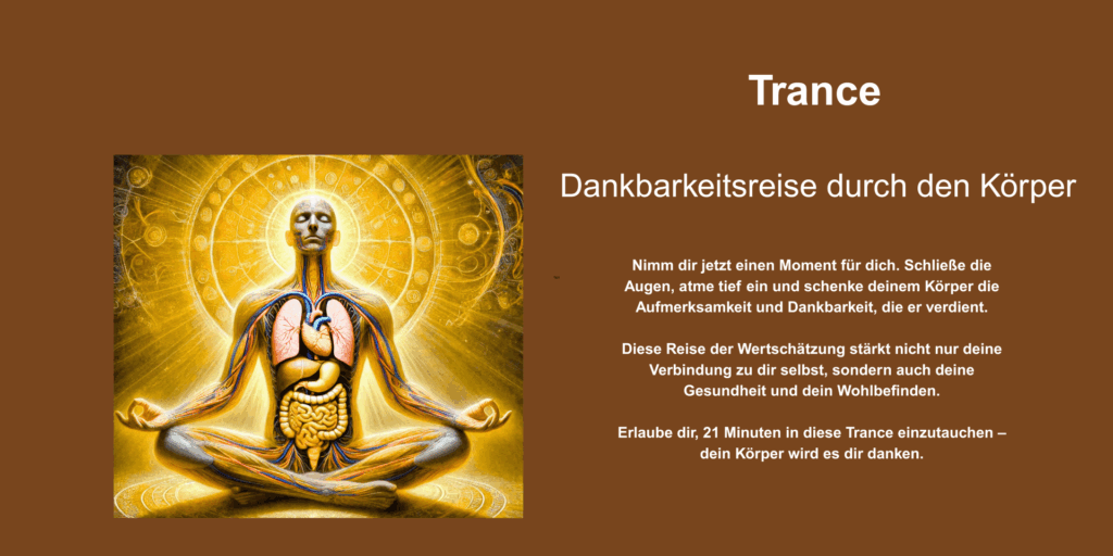 Lass dich auf diese Reise der Entspannung und inneren Ruhe ein. Spüre, wie du loslässt, tiefer sinkst und vollkommen zur Ruhe kommst. Erlaube dir diesen Moment der einzigartigen Vielfalt – voller Gelassenheit und Wohlbefinden. Bist du bereit, den ersten Schritt zu machen? Sie geht sehr tief in das Unterbewusstsein und unterstützt dich zur Stärkung von Mut, bedingungsloser Liebe, Urvertrauen, Selbstbewusstsein und Achtsamkeit.